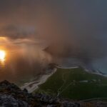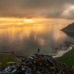 At 484m, the summit rewards hikers with breathtaking panoramic views, including the golden beaches of Skagsanden and Flakstadsanden, the deep blue Norwegian Sea, and the towering Hustinden (691m) in the distance.