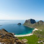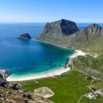 The first section climbs gradually through low birch trees and shrubs, offering glimpses of the coastline through the trees. After about 10–15 minutes, the vegetation becomes sparser, and the trail opens up to a grassy hillside with fantastic views toward the ocean. Here, you’ll get your first view of the stunning white-sand beaches of Vik and Haukland, with their turquoise waters creating a breathtaking contrast against the rugged Lofoten landscape.